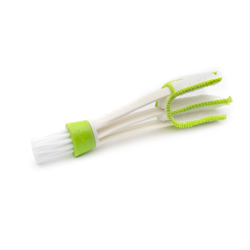 Удобная двусторонняя щётка-кисть для чистки труднодоступных мест в автомобиле. С одной стороны кисточки расположена жесткая гибкая щетина, с другой специальные плоскости для очистки дефлектора со съемными насадками из мягкой микрофибры. Такую щетку так же можно использовать для очистки от пыли жалюзи, клавиатуры и тд.